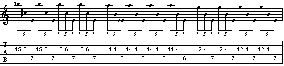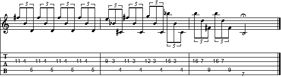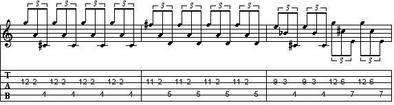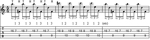Ogni battuta comprende una serie di quattro gruppi di terzine. Ogni terzina viene suonata con il tapping sul primo ottavo, il legato discendete alla mano sinistra sul secondo e l'hammer-on fatto sempre dalla mano sinistra sulla quinta corda come ultimo ottavo. Ecco qualche consiglio: