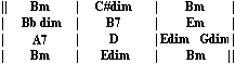 Mantenendo sempre la stessa tecnica di esecuzione, basata quindi sull'uso di tapping in terza corda e hammer-on su quinta, lavoriamo con una serie di accordi la cui successione rientra negli stilemi classici molto in voga nel rock-classic-pop anni '80. Ovviamente sempre in modo minore. Proviamo ad analizzare il brano.