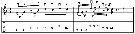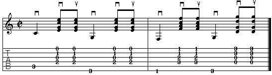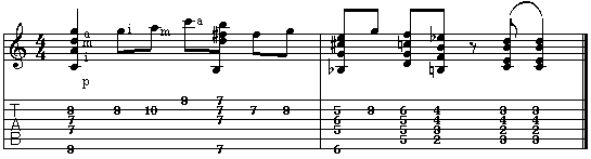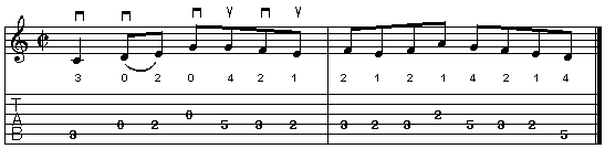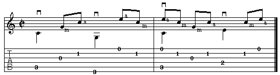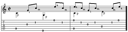 E' comune utilizzare anche il plettro al posto del pollice in una sorta di pennata ibrida. Lo stesso esempio precedente lo possiamo vedere subito sotto con i bassi suonati dal plettro e le altre note arpeggiate dalle dita della destra. Fate attenzione alla diteggiatura proprio di queste dita.