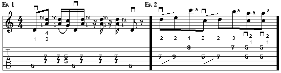L'Hybrid Picking è per definizione un modo di utilizzare, unitamente al plettro, anche le altre dita della mano destra. Le possibilità che offre questo tipo di tecnica sono plurime. Ad esempio, è possibile suonare ad accordi definendo solo alcune corde (es. 1), calcolando che la corda più bassa viene suonata dal plettro e quindi la nota creata risulta con un suono più nitido e definito (perchè carica di frequenze acute tipiche della pennata) rispetto alle note suonate dalle dita della destra, più morbide a causa del tocco, appunto, delle dita stesse. Oppure è possibile creare delle linee melodiche a note singole (ma non solo) caratterizzate da intervalli molto larghi tra le note (es. 2). E' possibile anche eseguire arpeggi ad accordi, oppure slappare le corde, rubando una tecnica tanto cara ai bassisti. Infine, può essere rilevante il fatto che le dita della destra, comunque, possono calibrare il suono ed il timbro suonando con le unghie o con il polpastrello.