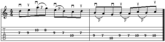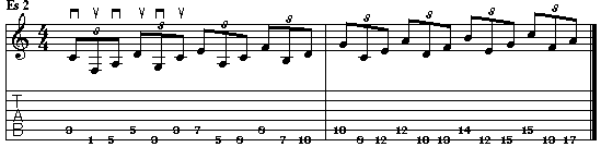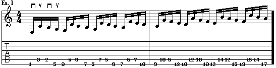 Nel secondo esempio, sempre su due corde, ogni nota della scala maggiore (su quinta corda) viene seguita da una coppia di note