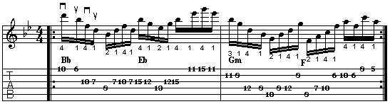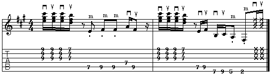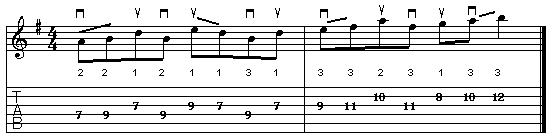 Si usa lo string skipping (salto di corda) ogni qualvolta si salta da una corda ad una altra non adiacente, ed è un'azione che sostanzialmente si compie spesso sulla chitarra. Questo per identificare il significato del termine. In realtà, quando si tratta questa tecnica ci si riferisce ad un sistema di pennata abbastanza complesso e di non facile attuazione in quanto, il più delle volte, abbinato anche ad una esecuzione basata sulla velocità, con le relative difficoltà pratiche e di pulizia del suono (leggi = tutte le note si devono sentire). L'esempio a tergo riporta un pattern che utilizza lo string skipping sulle triadi. Fate attenzione alla pennata e alla corretta diteggiatura della mano sinistra.