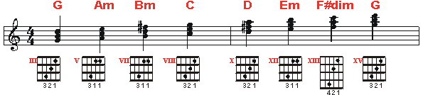 La diteggiatura più classica dell'accordo di C maggiore in 1a posizione. Come vedete dal pentagramma, le note